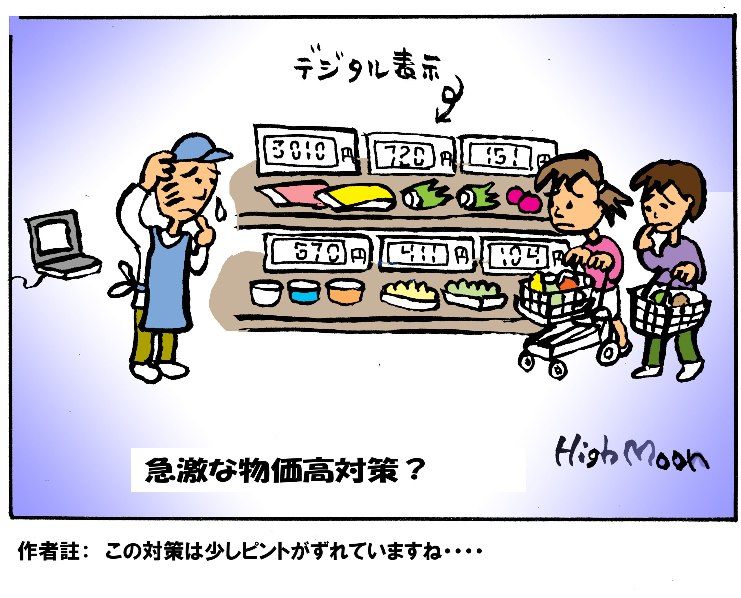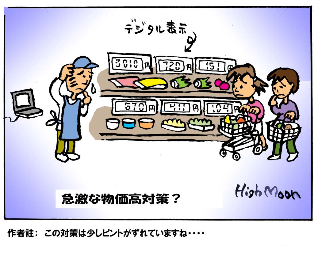最近はあらゆるものが値上がりして、われわれ庶民は頭が痛いところです。このマンガではあまりにも急激な価格変動で、いちいち値札を書き変えるのが大変なので、思い切つて値札を電光掲示板にしたスーパーの店頭を風刺したものです。しかし、こんな物価高対策は本来的なものではなくて、やはり、物の生産、流通に関する適切な対策が求められるところです。